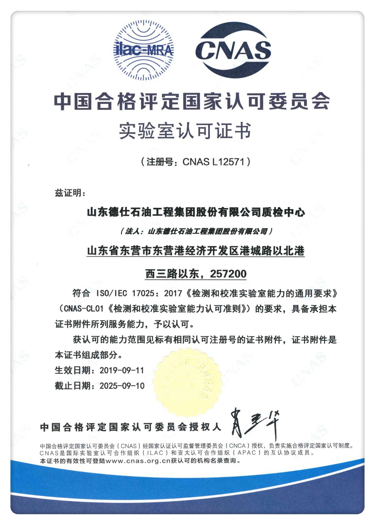 2019年9月11日,山东德仕石油工程集团股份有限公司顺利取得CNAS认可证书。