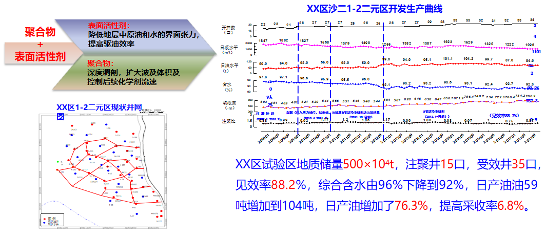 二元复合驱体系中活性剂能大大地降低地层中原油和水的界面张力,提高驱油率,聚合物能起到深度调剖,扩大波及体积及控制后续化学剂流速的作用,两者对增油起到很好的协同效应。