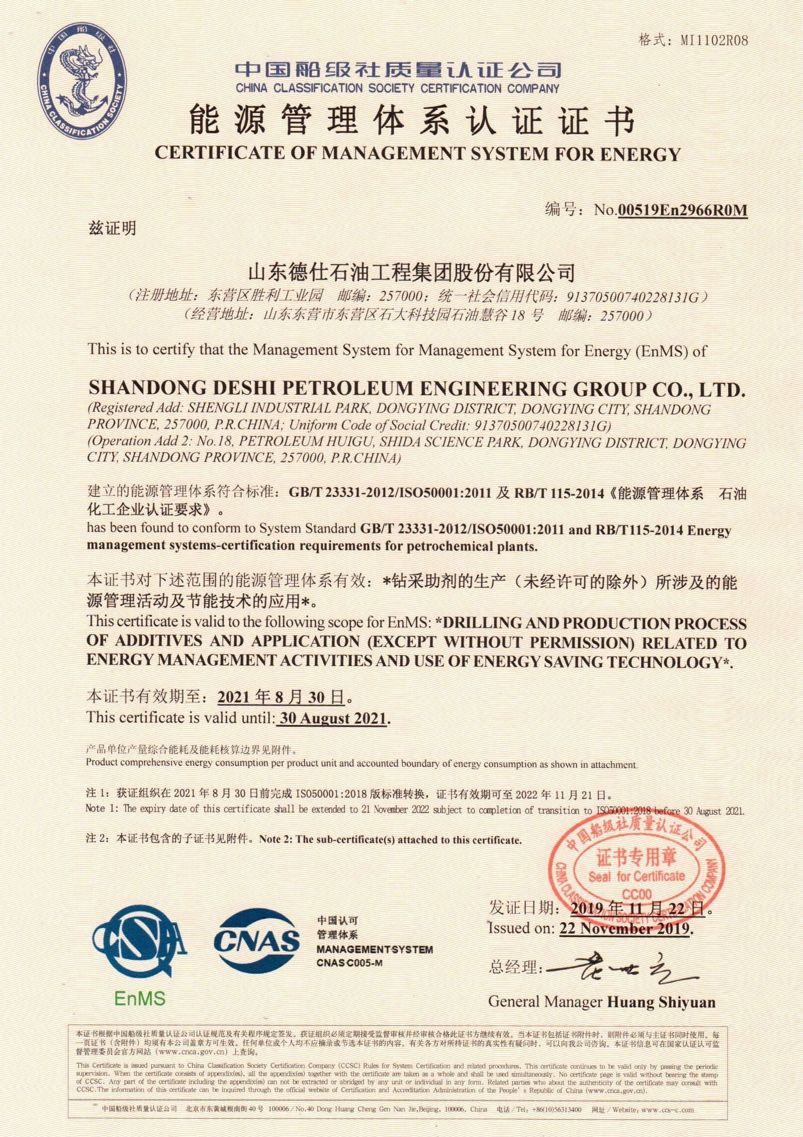 山东德仕石油工程集团股份有限公司通过能源管理体系认证